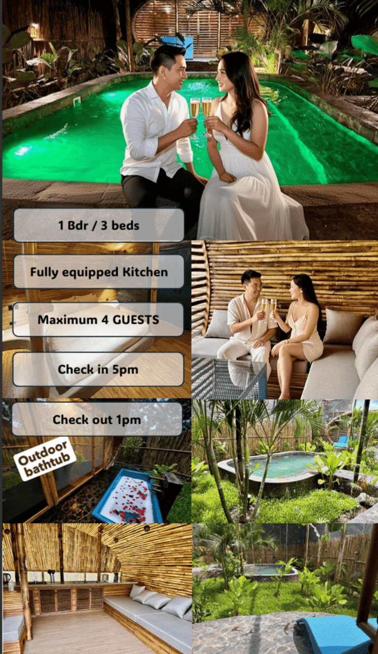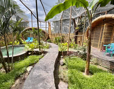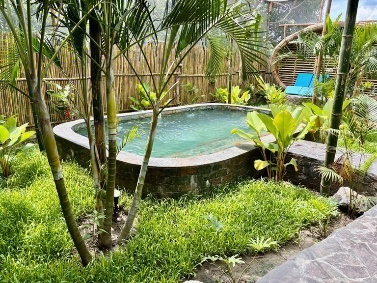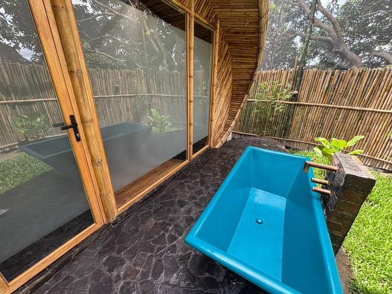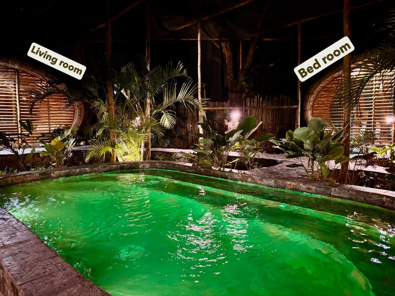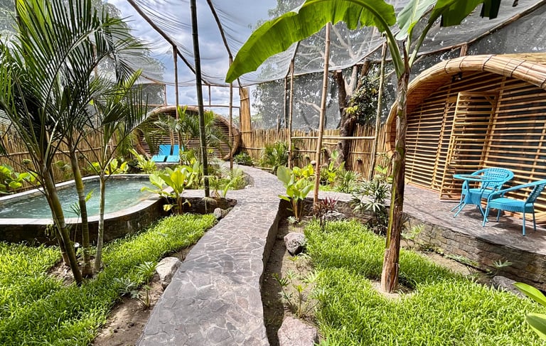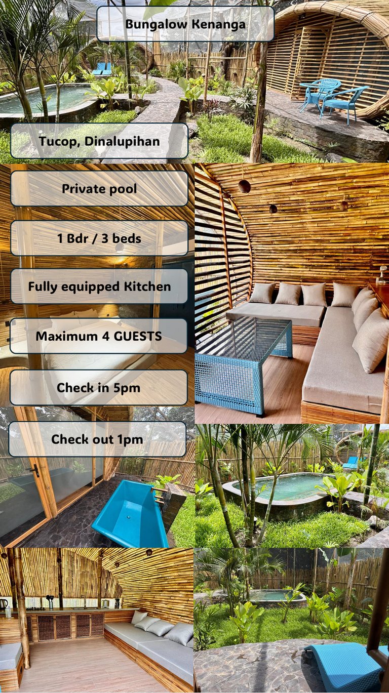 Escape to Bungalow Kenanga, a handcrafted bamboo villa with a private pool, tropical garden, and outdoor bathtub. Features a king bed, two single sofa beds, full kitchen, and indoor shower. Perfect for couples or small families seeking a serene nature retreat.
