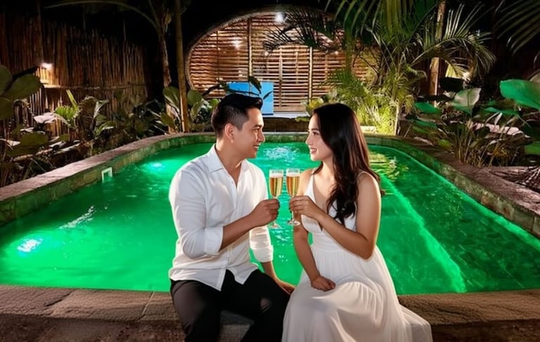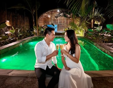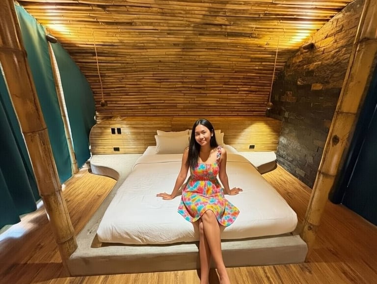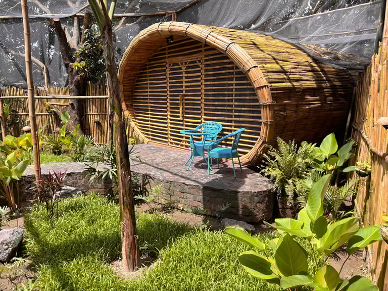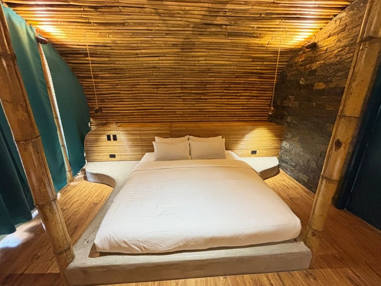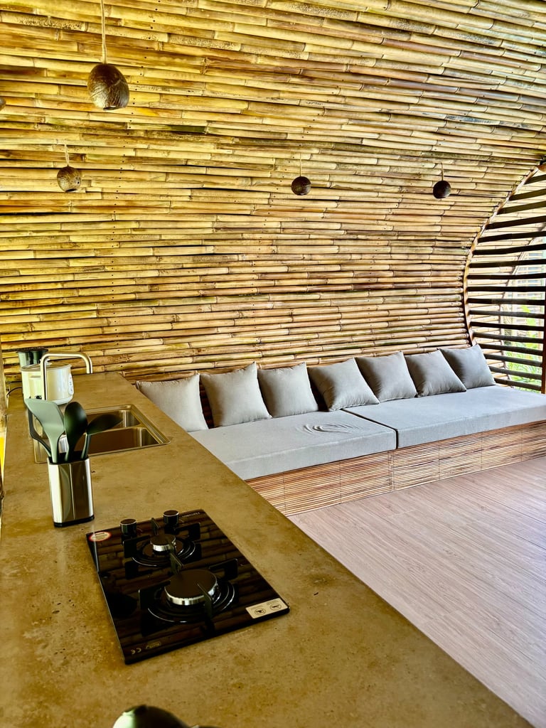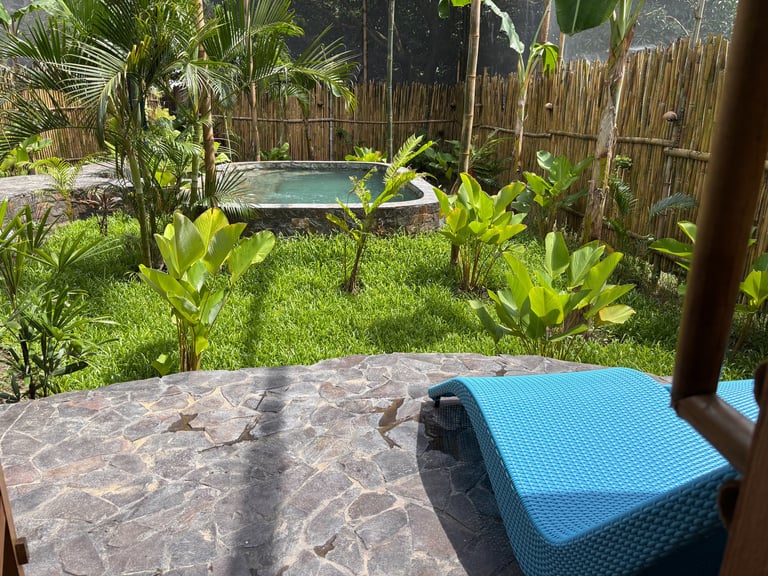 Escape to Bungalow Kenanga, a handcrafted bamboo villa with a private pool, tropical garden, and outdoor bathtub. Features a king bed, two single sofa beds, full kitchen, and indoor shower. Perfect for couples or small families seeking a serene nature retreat.